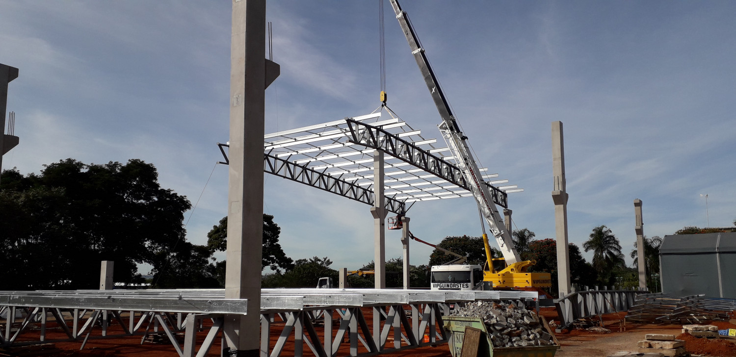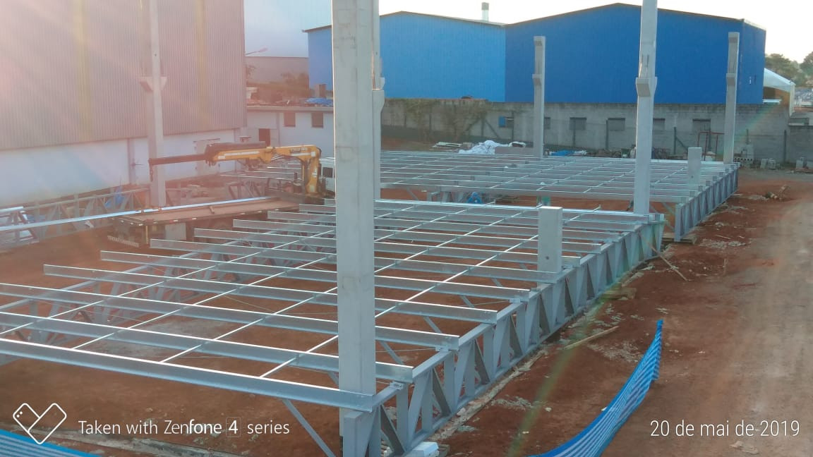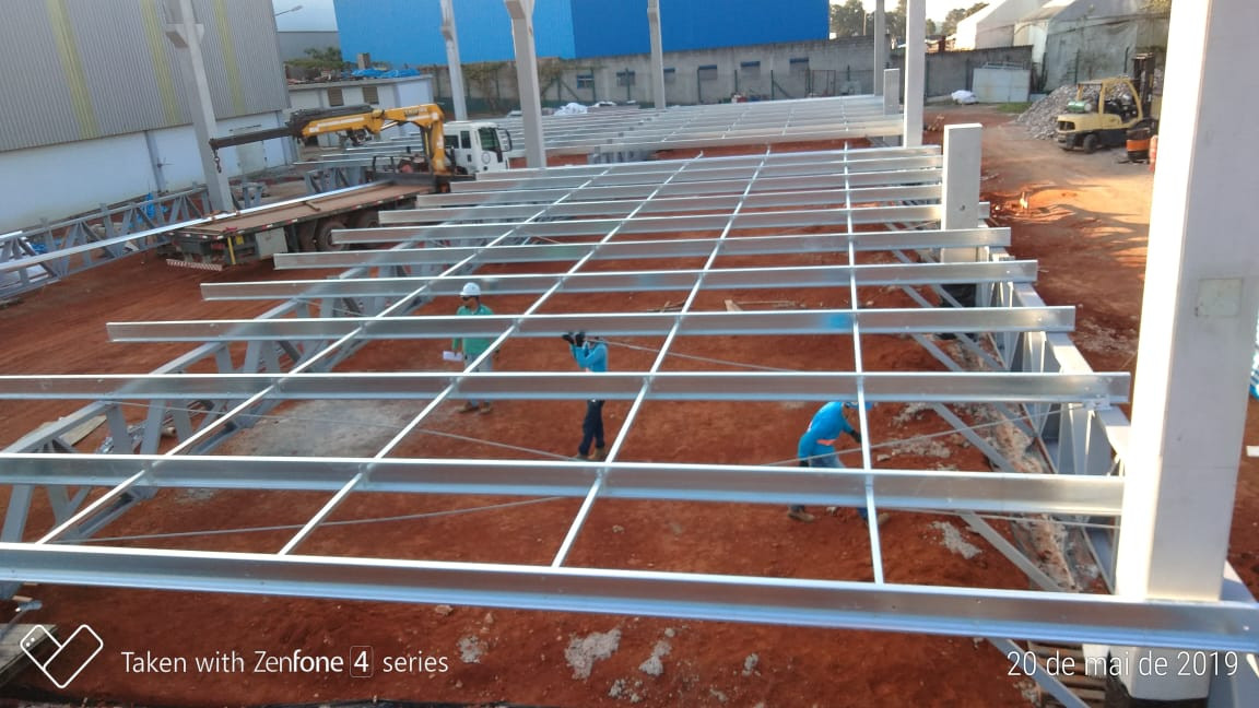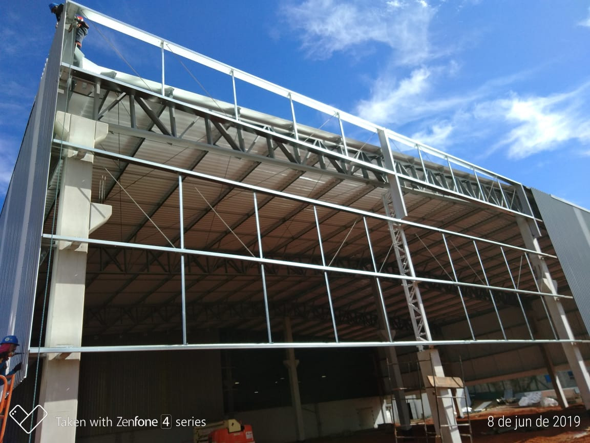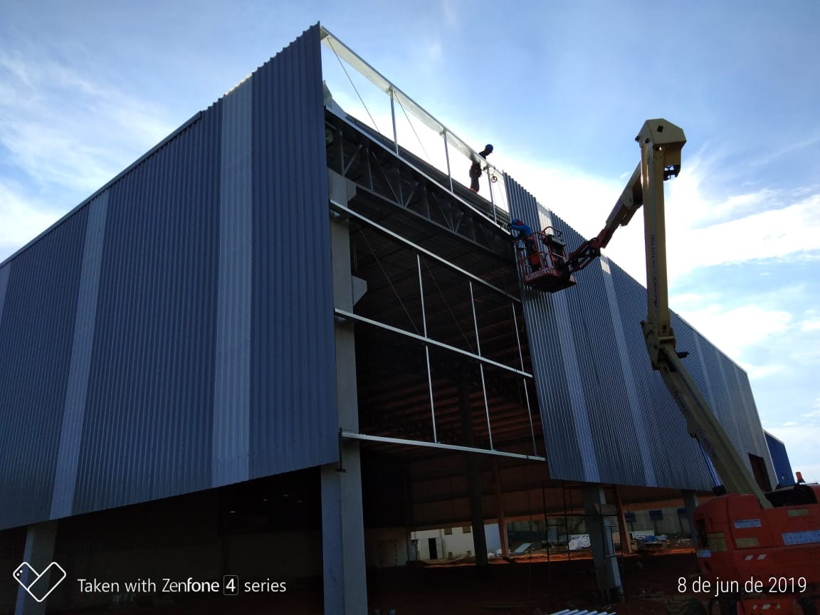 Obra da Mercosul Montagens de estruturas metálicas e confecção de telhado e fechamento lateral em telhas trapezoidais para ampliação de galpão industrial.